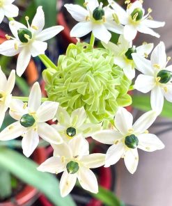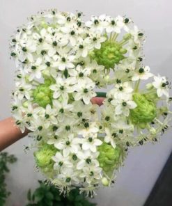 Những cánh hoa trắng mịn như sứ, điểm giữa là nhụy đen óng như viên ngọc quý – tạo nên vẻ đẹp tương phản vừa lạ vừa sang. Khi hoa nở rộ, chùm hoa tròn đều như một quả cầu trắng thanh tao, tỏa hương nhẹ nhàng và bền đến hơn 10 ngày.